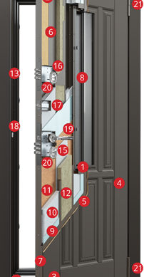 17. Задвижка "ночной сторож" – дополнительный защитный механизм, выполняющий функцию третьего замка. Гарантированная защита от проникновения снаружи.